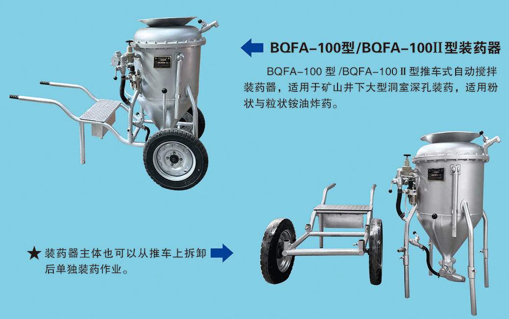 BQFA型自動攪拌系列裝藥器,與人工攪拌相比,無需人工攪拌,節(jié)省人力且攪拌均勻,移動方便,操作簡單便捷,大大降低人工勞動強度,提高裝藥密度、爆破質(zhì)量,減少施工作業(yè)時間。先后出口塔吉克斯坦、老撾,秘魯,尼日利亞、法國等國家,使用情況反饋中得到一致好評并大力推薦。