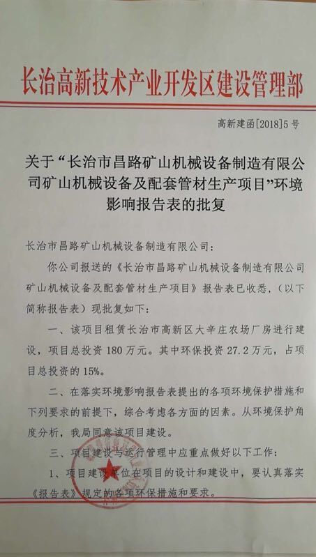 關(guān)于“長治市昌路礦山機械設(shè)備制造有限公司礦山機械設(shè)備及配套管材生產(chǎn)項目”環(huán)境影響報告表的批復(fù)